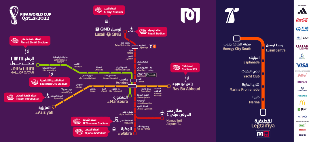 以第一條地鐵線紅線為例,最南端的艾爾沃克拉站是賈努布球場,最北端的盧塞爾站是盧塞爾球場;金線,最東邊的拉斯布阿布德站是974球場,最西邊的體育城站是哈里法國際體育場;綠線,最西邊的爾里法卡塔爾購物中心站是本·阿里球場,相隔一站,便是教育城體育場。