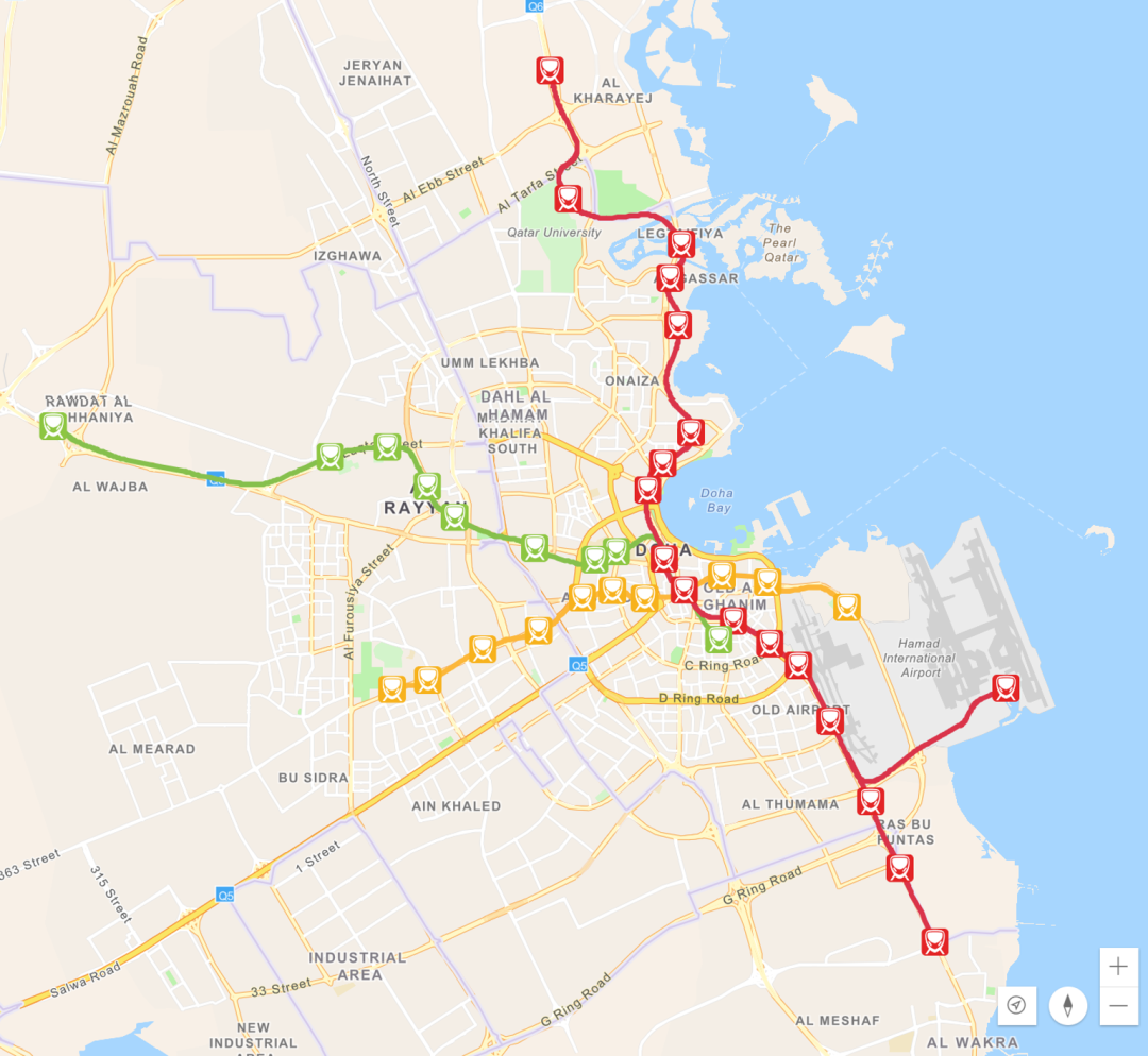 紅線南起瓦克拉,北至盧賽爾,全長40公里。這條線路還將 1 號航站樓的哈馬德國際機場連接到市中心。它目前有 18 個活躍的站點,特別是西灣 - 卡塔爾能源、卡塔拉和卡塔爾大學。紅線有兩個地鐵線路換乘站——Al Bidda 用于紅線和綠線之間的換乘,Msheireb 用于所有三條線路之間的換乘。它還提供地鐵和電車與 Legtaifiya 和 Lusail QNB 之間的換乘站。