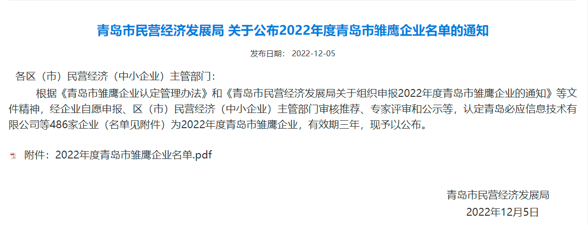 2022年11月,青島市政府召開青島市雛鷹企業認定管理辦法新聞發布會并啟動了首次雛鷹企業認定。雛鷹企業的培育認定工作是今年青島市的一項創新性工作,今年市政府工作報告中提出,支持創新型企業發展,培育一批雛鷹企業、瞪羚企業和獨角獸企業,其中培育雛鷹企業300家以上。